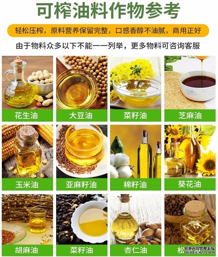 該設(shè)備可適用于菜籽、花生、茶籽、大豆、核桃、葵花籽等油料的生產(chǎn)加工,且壓榨出的油品綠色環(huán)保,對(duì)人體健康有益無害。購買此機(jī)后可長期穩(wěn)定作業(yè),對(duì)于中、小油廠和鄉(xiāng)鎮(zhèn)個(gè)體企業(yè)都很適用。